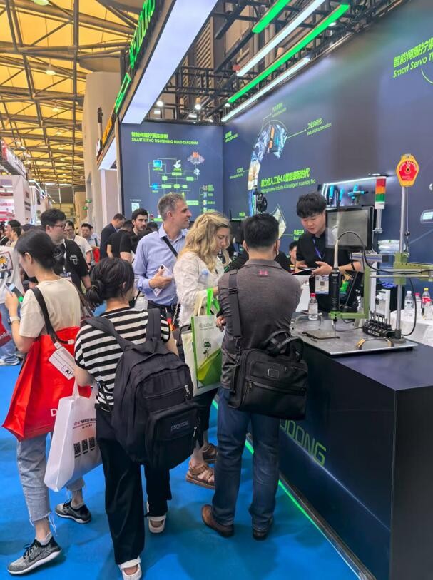 展位動(dòng)態(tài)演示區(qū)通過(guò)智能伺服擰緊連接圖,清晰展示工業(yè)電腦、PLC等組件與擰緊工具的協(xié)同工作原理。此外,演示區(qū)配備的屏幕實(shí)時(shí)模擬擰緊力矩曲線與工作狀態(tài),觀眾可直觀理解產(chǎn)品的智能化特性。現(xiàn)場(chǎng)工作人員介紹,該技術(shù)已成功應(yīng)用于航空航天、3C電子等領(lǐng)域,顯著提升裝配效率與質(zhì)量。